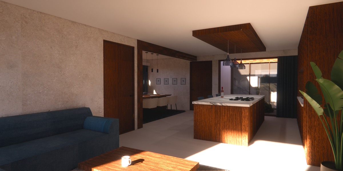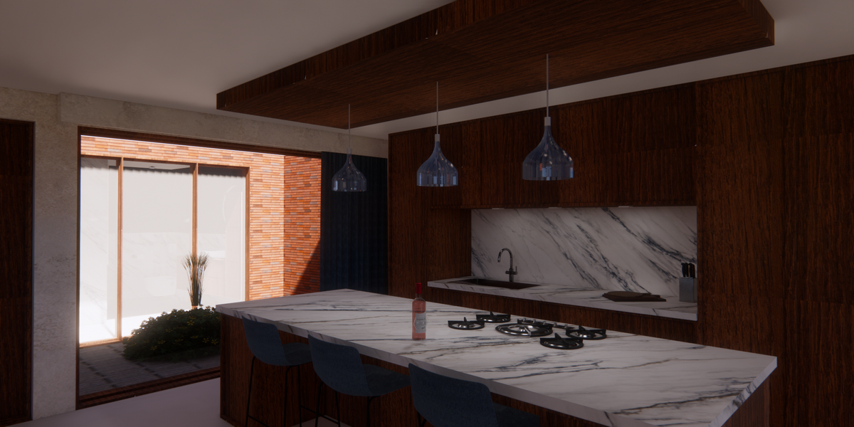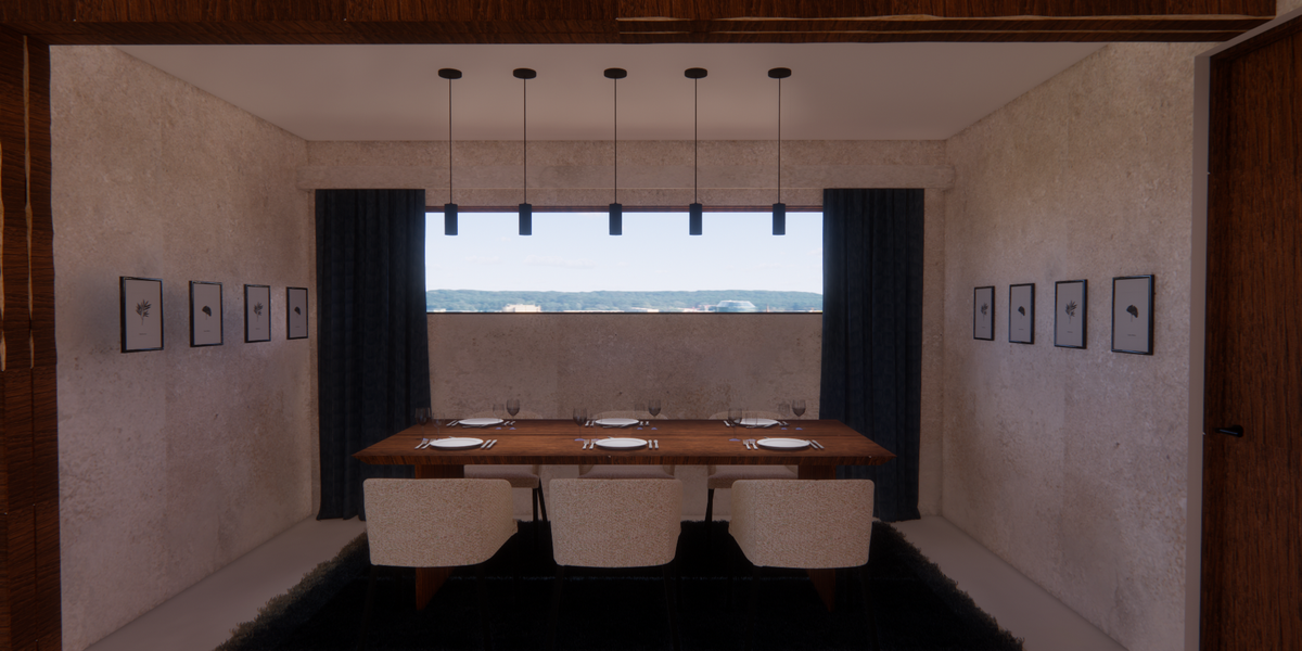 De woning moest geschikt zijn voor het ontvangen van vrienden en familie, zowel voor kleinere familiefeestjes als grotere bijeenkomsten zoals een nieuwjaarsfeest voor ongeveer 50 personen. Dit heb ik toegepast in het woongedeelte. De schuifdeuren naar de binnentuin kunnen worden geopend, wat zorgt voor extra ruimte en ventilatie. Wanneer de tafel wordt verplaatst, ontstaat er voldoende plek voor een dansvloer of statafels. Het kookeiland fungeert tijdens feestjes vanzelfsprekend als bar.