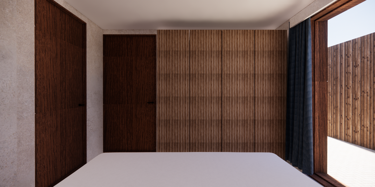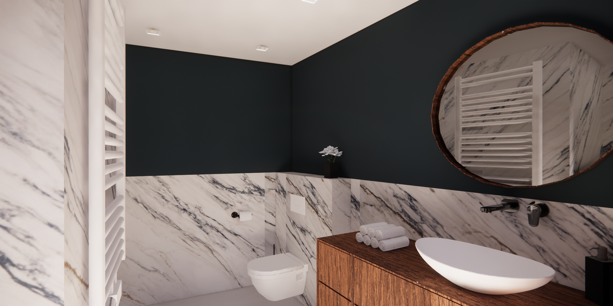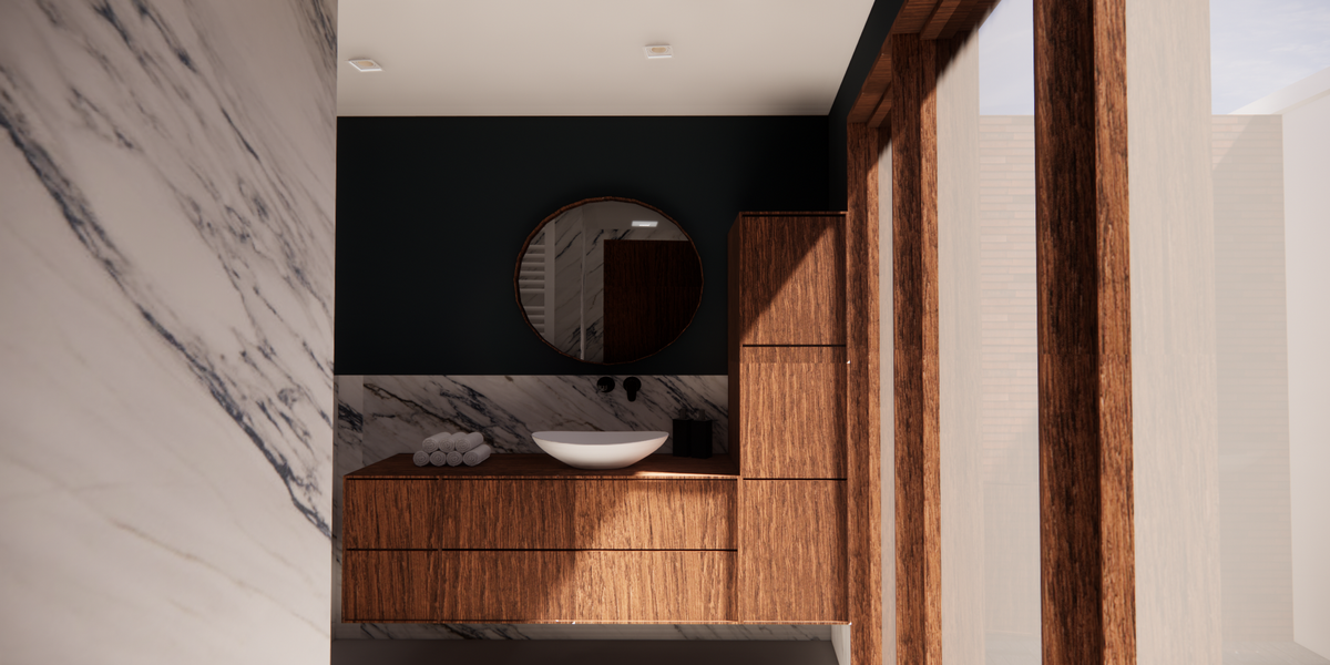 Een raam in de badkamer was een belangrijke eis, aangezien de badkamer op de bovenverdieping dit niet heeft. Hierdoor blijft daar veel vocht hangen. Om dit te voorkomen, is er in deze badkamer wel een raam toegepast. Dit heb ik opgelost door schuifdeuren te plaatsen die toegang geven tot de binnentuin, wat zorgt voor natuurlijke ventilatie en daglicht.